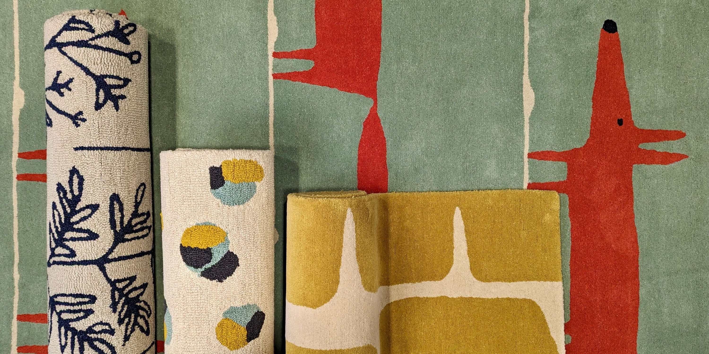 Children will love this simple Scion Mr Fox rug. A denim blue background is decorated with a repeating orange fox motif and white lines. Place it in your child's bedroom and pile it high with toys or if you're feeling adventrous, add it to your living room for a fun, retro look.