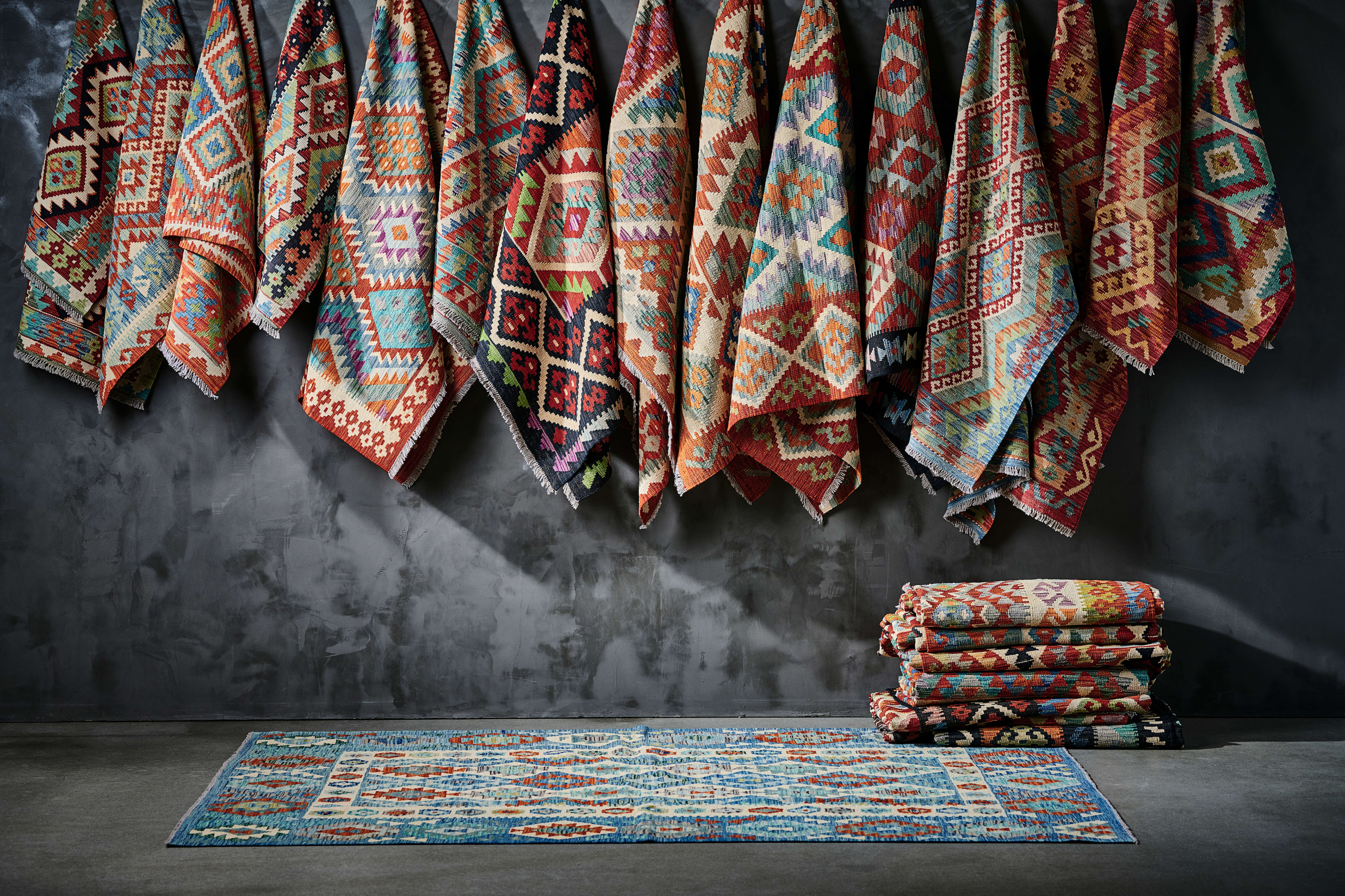 Handwoven in Afghanistan, this multicolour kilim flatweave rug comprises rich and colourful hues, carefully woven to create a striking geometric chevron design.