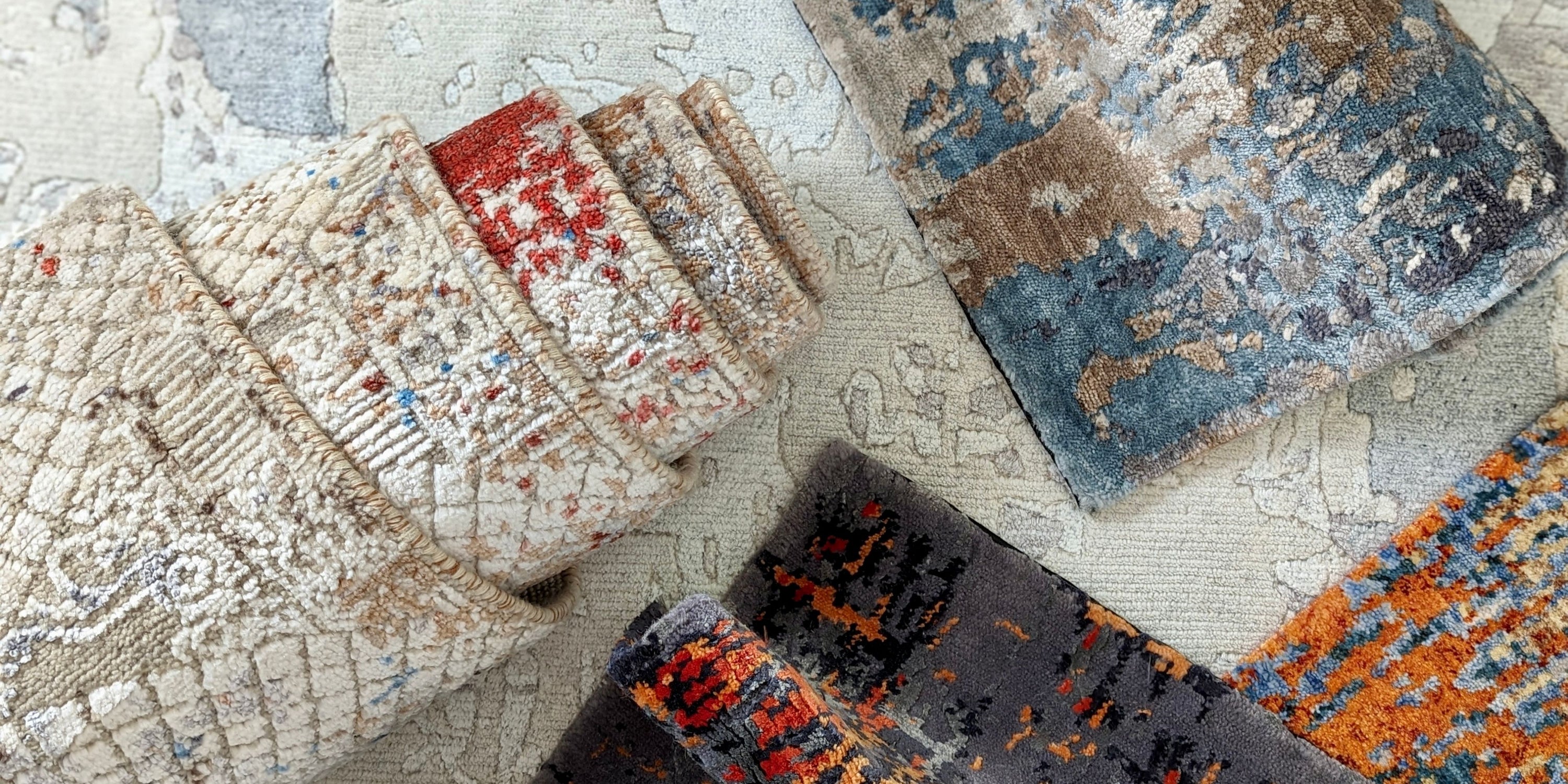 A touch of modern luxury; this area rug would be an elegant centrepiece in your living room or bedroom. Woven pure viscose, touches of blue, grey, purple and terracotta accentuate the beige base to create a striking distressed abstract design. Handmade in India by highly-skilled craftsmen, this chic piece is well suited for modern, minimalist, industrial and contemporary homes. With a lavish shine and a beautiful silk-like texture, this striking piece will draw the eye wherever it is placed.
