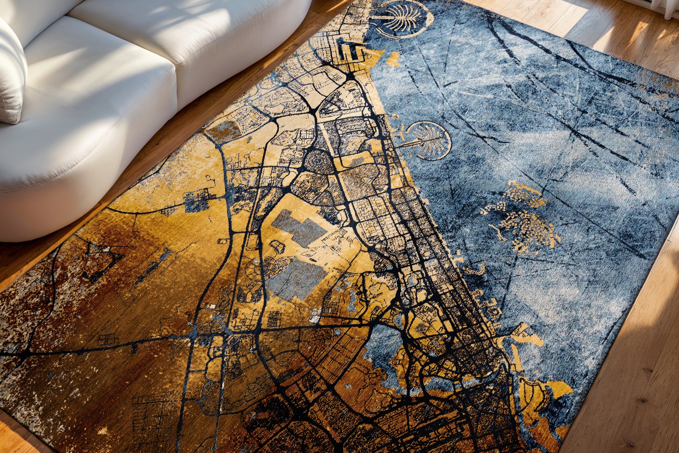 Introducing the Dubai Gold Sea rug from the Cities Collection by Louis De Poortere, a design inspired by the Dubai cityscape. The elegant rug features an eye-catching blue and gold colour palette. This rug is made from polyester, of which 40% is recycled. This is a washable rug which is perfect for high-traffic areas such as living rooms or dining rooms.