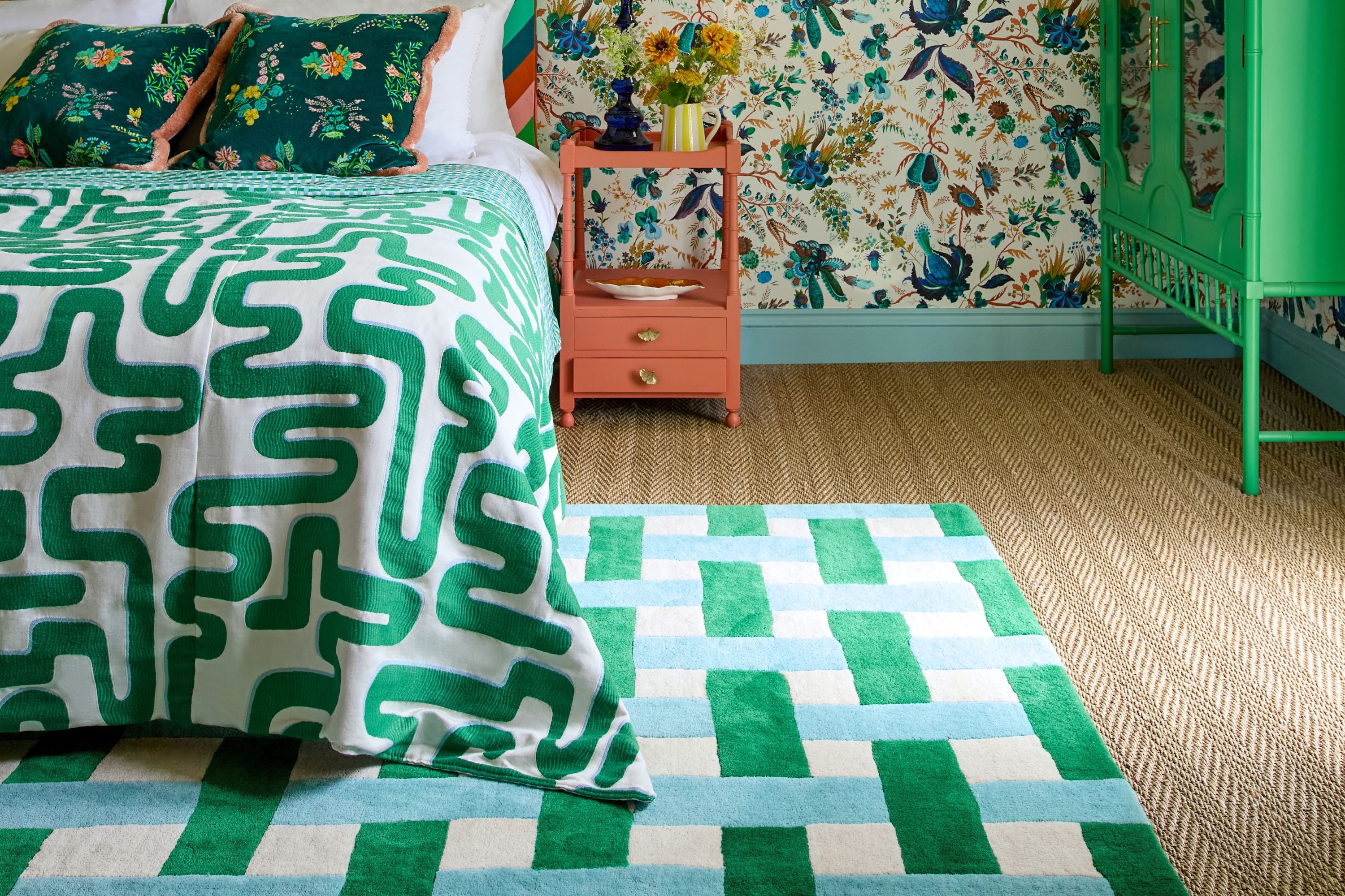 Indulge in luxurious softness with the Basketweave Emerald/Aquamarine rug. Inspired by summer picnics, tablecloths and baskets filled with fresh fruit, this rug is an homage to bright, happy summers. Rich tones of emerald, blue and cream make up a geometric tablecloth design, perfect for adding interest to a space. This rug forms part of the Sophie Robinson x Harlequin collection in a celebration of colour and style.
