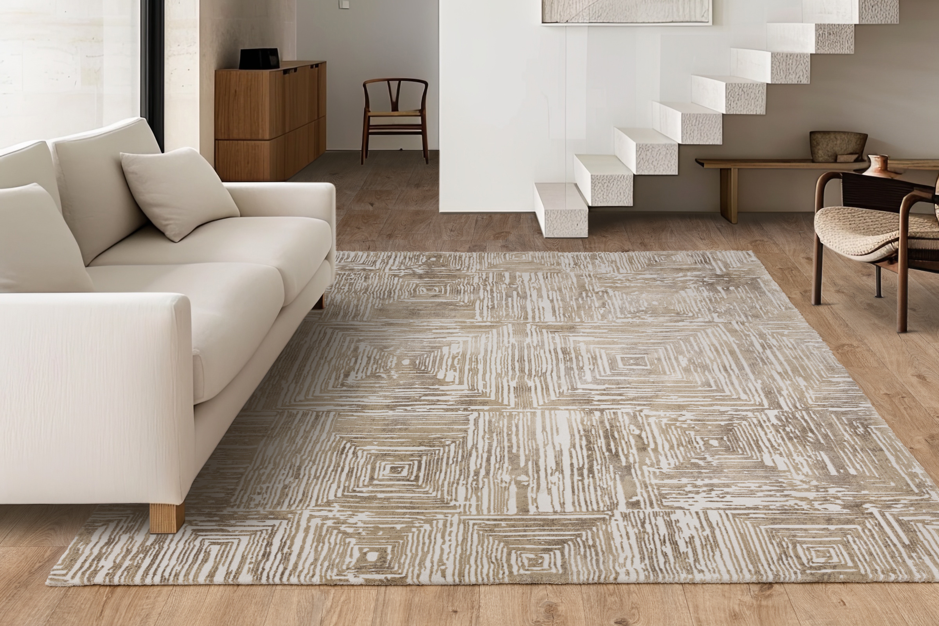 The Kuza Portrait Beige from Asiatic London features a velvety soft, multi-dimensional textured pile with an abstract geometric design in cream, and beige tones. Perfect for enhancing living rooms or bedrooms, this rug seamlessly blends elegance with functionality.