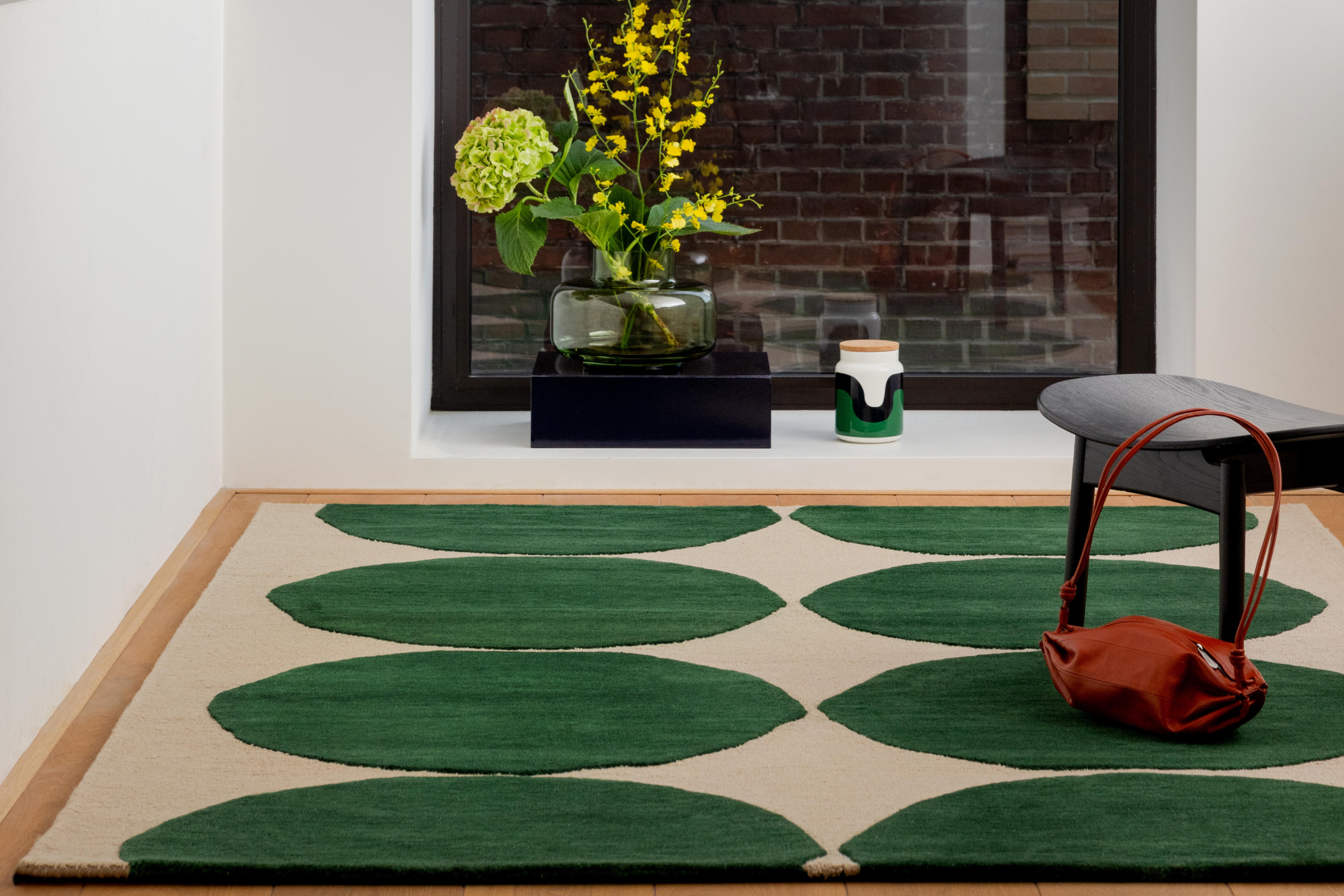 Joyful, bold, and timelessly appealing, the Isot Kivet Green rug is crafted from pure New Zealand wool. Based on Maija Isola's Kivet (Stones) design, the playful geometric print includes shades of beige and forest green. Perfect for modern, minimalist and Scandi-style interiors alike, this eye-catching rug is guaranteed to add warmth and interest to your home wherever it is placed.