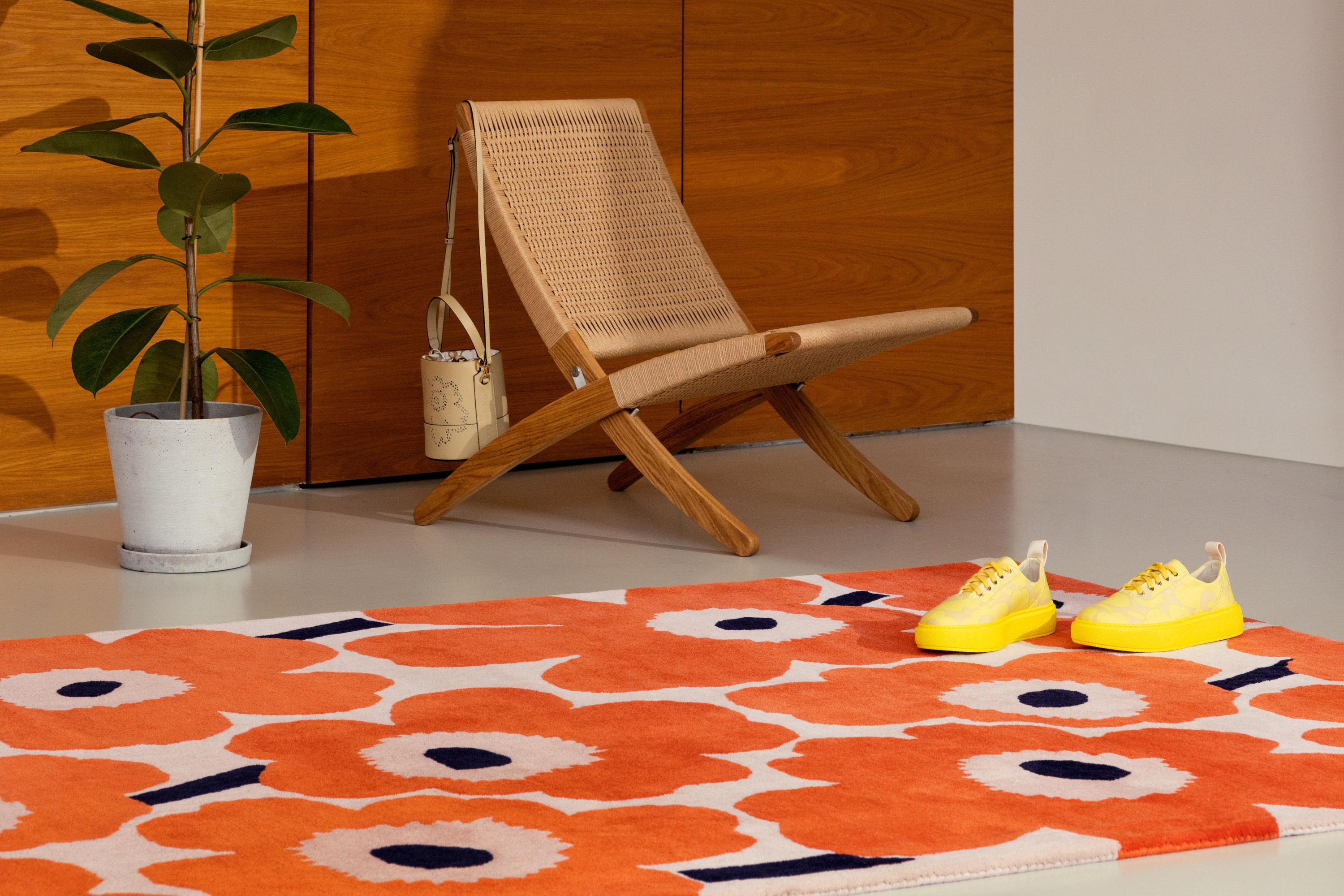 Handtufted from high-quality New Zealand wool, the Marimekko Unikko Orange Red Rug features a joyfully vibrant colour palette of orange, cream and charcoal. This rug features the classic pop-art inspired Unikko print by Marimekko and is luxuriously soft underfoot.