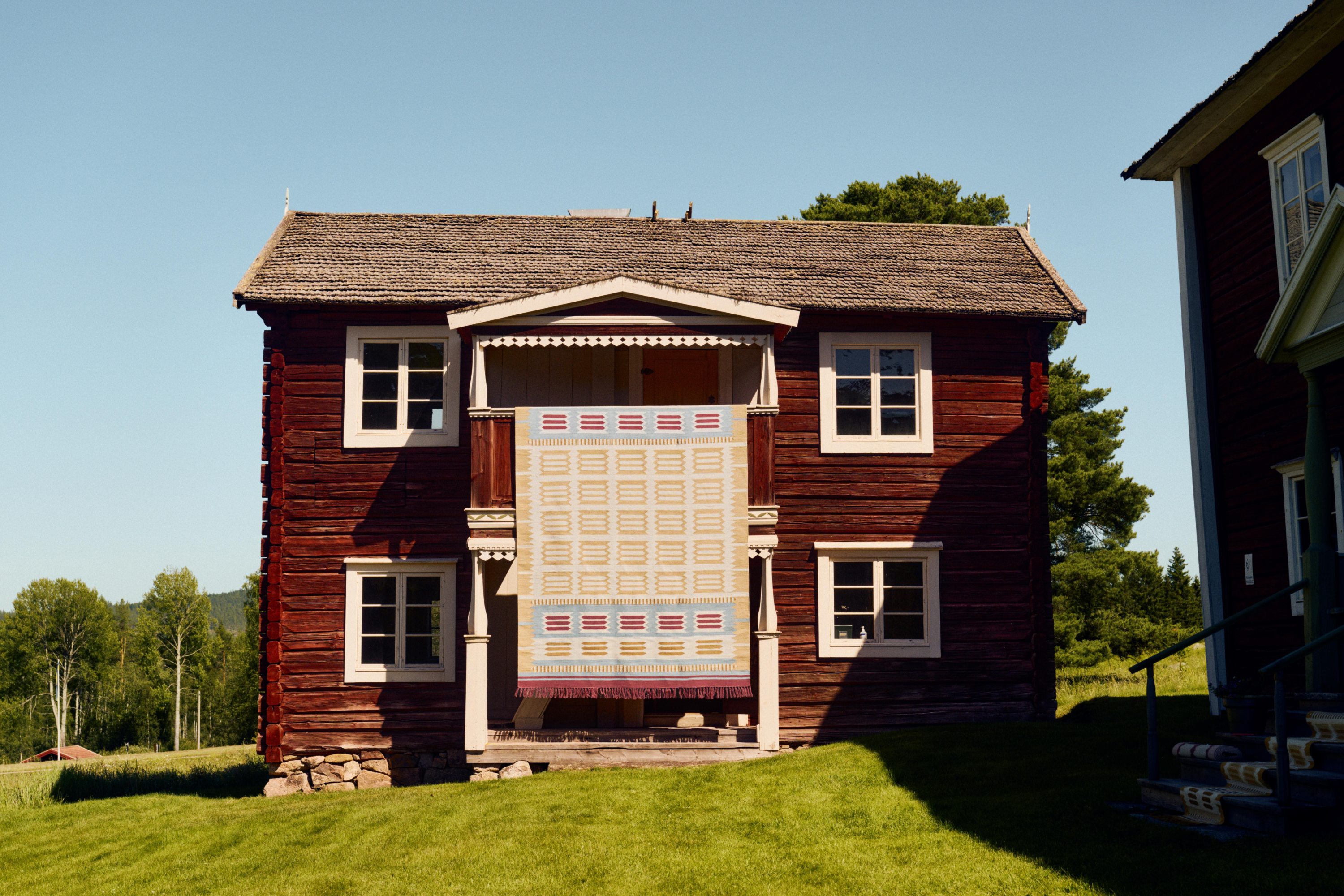 Inspired by Swedish folk traditions, this handwoven Röllakan Hilma Meadow rug by LAYERED, celebrates generations of Scandinavian craftsmanship. This rug features geometric patterns and thoughtfully balanced colours of beige, blue and red that blend heritage with contemporary design.