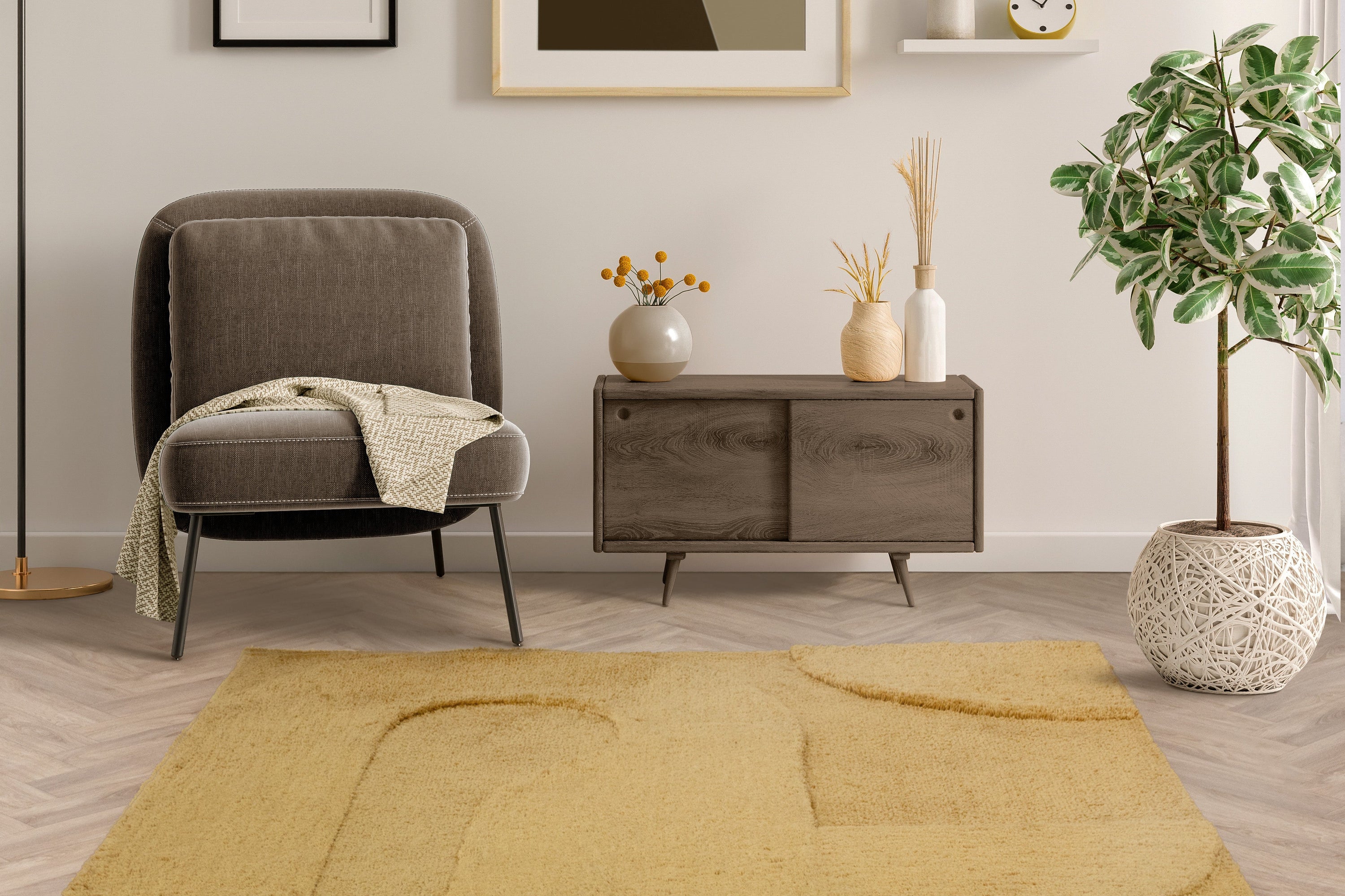 The Tova Ochre Rug from Asiatic London features intricately carved geometric patterns woven with polyester yarns in a monotone palette. This rug offers a rich texture and elegant design, making it an excellent addition to living rooms and bedrooms alike.
