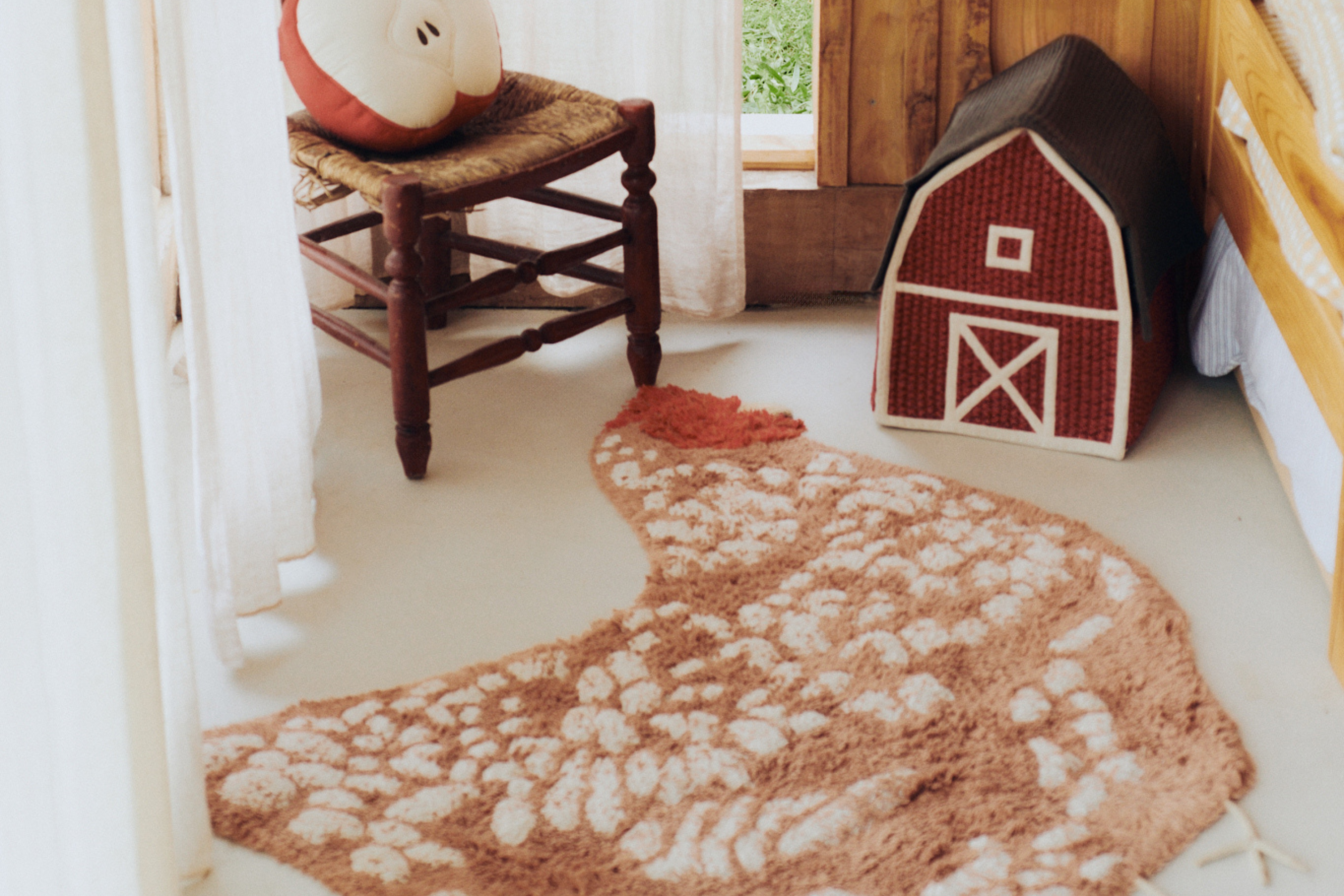 The Washable Rug Chicken by Lorena Canals is a handcrafted cotton rug shaped like a chicken, featuring a warm terracotta brown background and delightful feather details. Its movable cord legs add a playful twist, making it a fun focal point in any bedroom or playroom. Easy to clean and vibrant, this rug is a cheerful way to brighten up your little one's space. If any accidents or spillages occur, simply wash in a domestic washing machine, on a delicate setting.