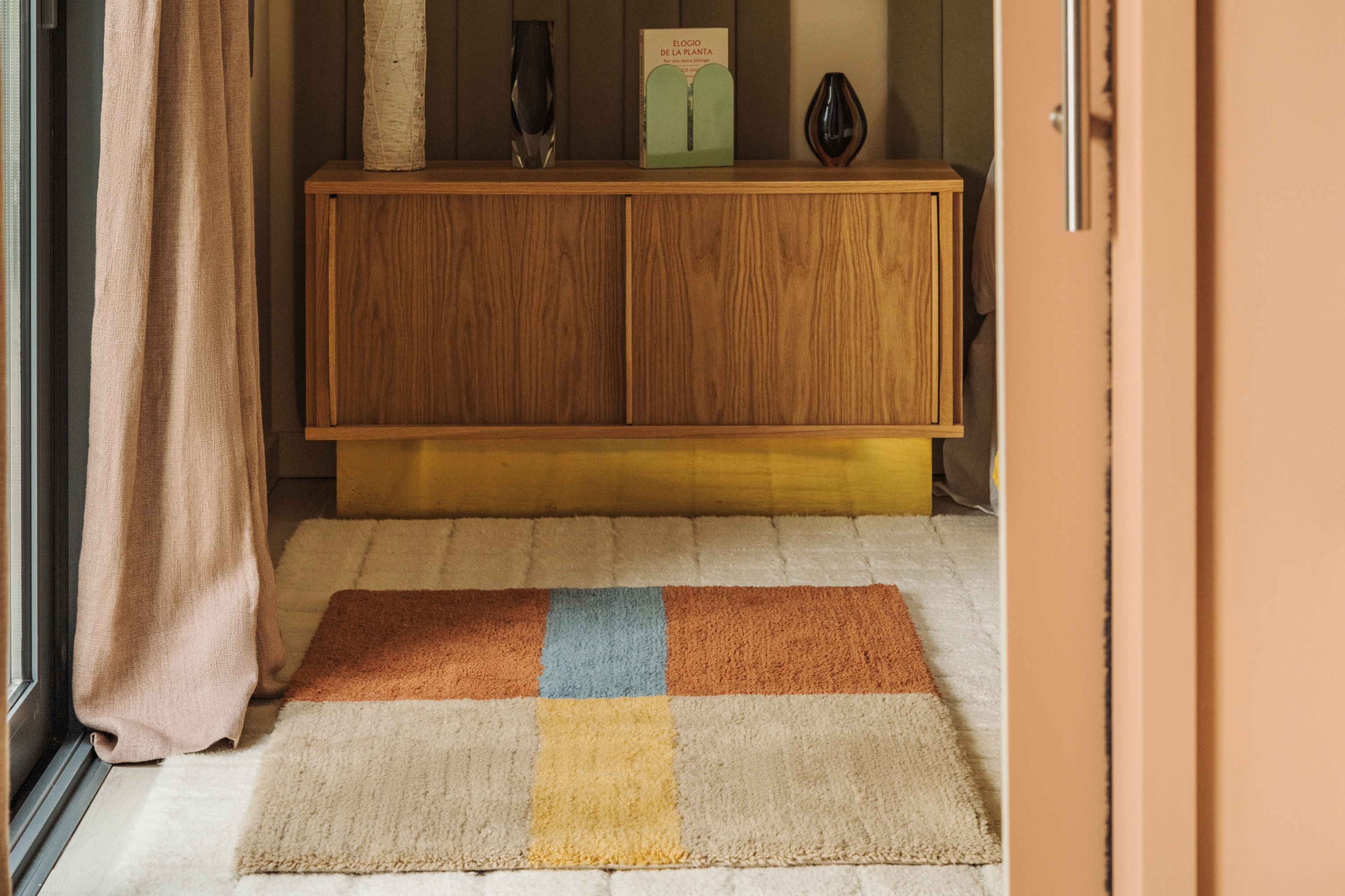 The Wool Rug Chroma Cinnamon by Lorena Canals infuses your home with subtle vibrancy through its elegant patchwork design in Cinnamon and Sandstone accented by lines in Ocean Blue and Caramel. Ideal for living rooms, bedrooms and dining rooms, it will bring interest to any space.